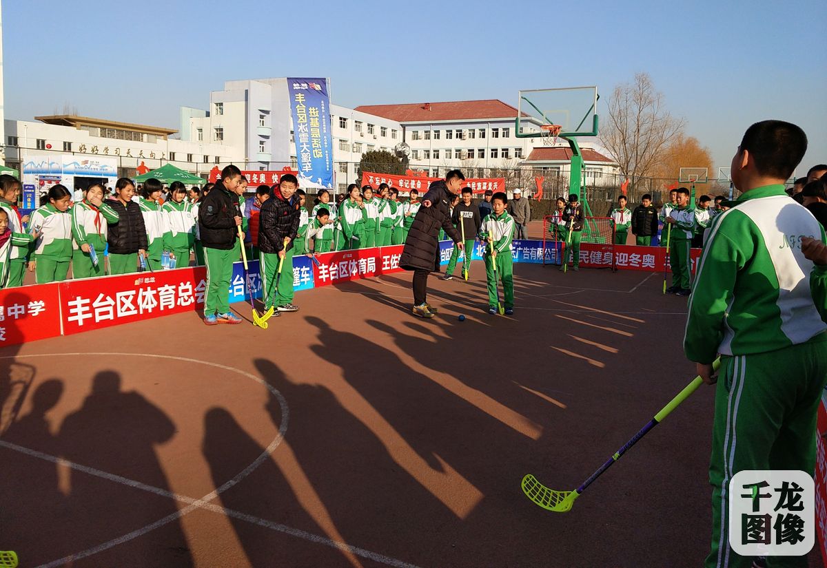 1月5日,由丰台区体育局主办的“冰雪大篷车”进基层活动走进王佐镇民大附中丰台实验学校,为北京2022年冬奥会营造氛围。图为活动现场学生们体验旱地冰球。千龙网发 大胡摄