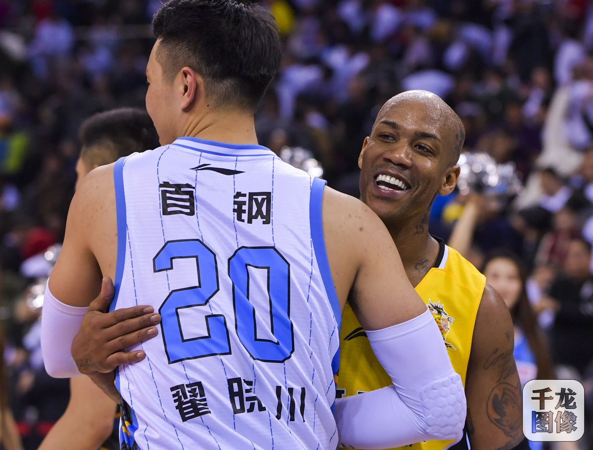 1月11日,2017至2018赛季CBA常规赛第26轮,首钢男篮在与北京农商银行队的“京城德比”中以108比105取胜,拿到常规赛四连胜。图为马布里和翟晓川相拥瞬间。千龙网发 胡科摄