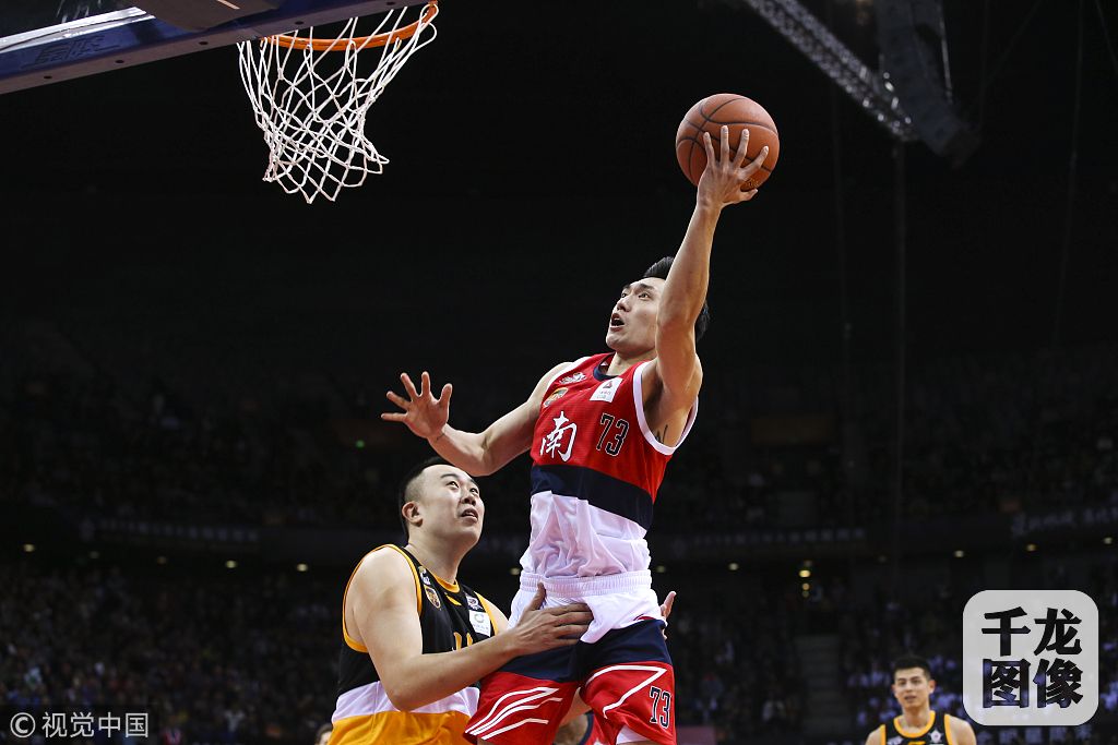 2018年1月14日,CBA全明星正赛在深圳举行,南方明星队以147-138战胜北方明星队。图为赵泰隆上篮,韩德君防守。视觉中国供图 千龙网发