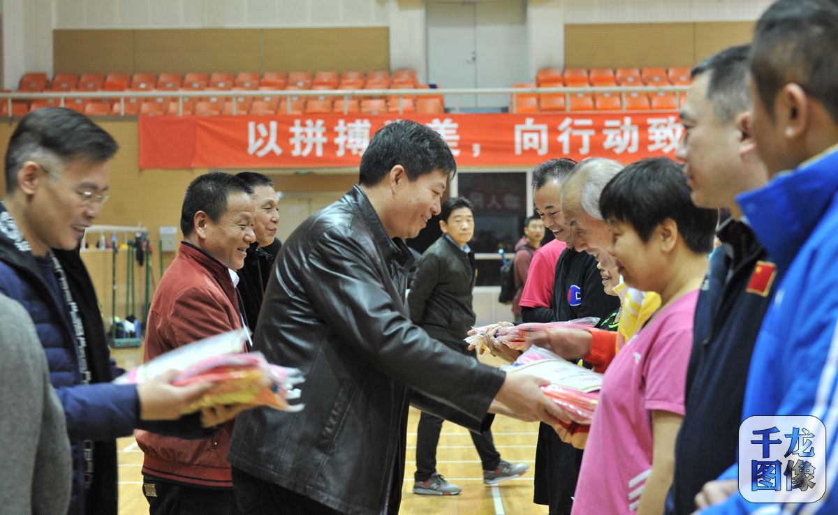 1月14日,2017年“佛雷斯”杯北京市民“快乐周末”系列赛羽毛球总决赛和保龄球总决赛暨2018年“快乐周末”系列赛(羽毛球、保龄球)启动仪式正地坛体育馆举行。图为与会嘉宾为获奖选手颁奖。千龙网发 吴晓萌摄