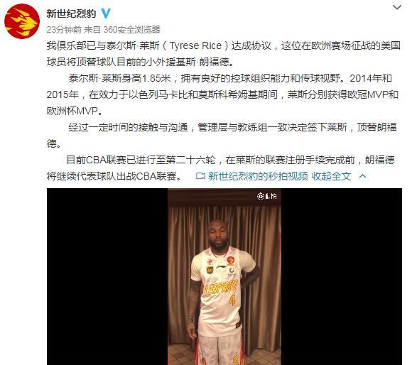深圳队发布公告,“我俱乐部已与莱斯达成协议,这位在欧洲赛场征战的美国球员将顶替球队目前的小外援朗福德。莱斯身高1.85米,拥有良好的控球组织能力和传球视野。2014年和2015年,在效力于以色列马卡比和莫斯科希姆基期间,莱斯分别获得欧冠MVP和欧洲杯MVP。经过一定时间的接触与沟通,管理层与教练组一致决定签下莱斯,顶替朗福德。目前CBA已进行至第26轮,在莱斯的联赛注册手续完成前,朗福德将继续代表球队出战CBA联赛。”