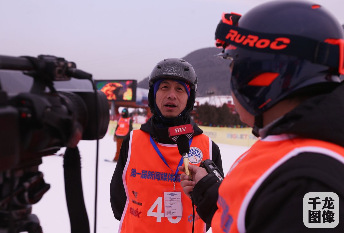 1月17日,“包商银行杯“第一届新闻媒体滑雪邀请赛于在军都山滑雪场落幕,18家媒体单位 ,近百位新闻工作者参赛。经过一天的适应场地训练,一天的比赛,高山滑雪男、女组双板冠军分别由中央电视台和北京晨报选手获得,高山滑雪男、女组单板冠军分别由北京晨报和央广网获得,中央电视台获得团体奖。 图为北京青年报40号选手汪浩舟接受采访。千龙网记者 戚连民摄