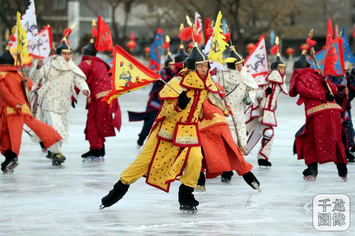 1月20日,2018北京市体育公益活动社区行启动仪式暨西城区什刹海冰雪嘉年华系列活动”在在什刹海冰场举行。图为传统的冰嬉表演。千龙网发 主办方供图