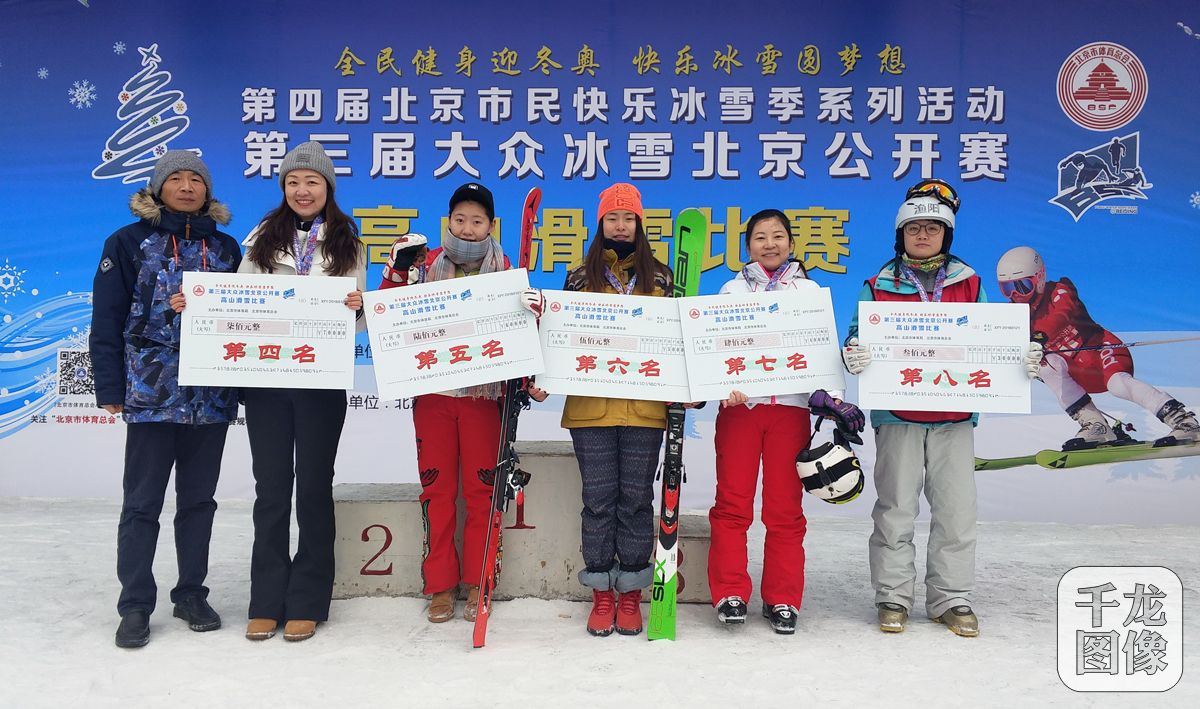 1月21日,第三届大众冰雪北京公开赛高山滑雪比赛在渔阳国际滑雪场展开了激烈角逐,本次吸引了来自京津冀以及其他省市的近两百名选手积极参与。图为北京市滑雪协会主席李晓明(左一)为获奖选手颁奖。千龙网发 主办方供图