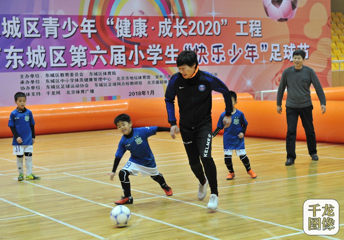 1月23日,东城区第六届“快乐少年”足球节决赛在地坛体育馆举行,此次比赛共计4天,来自东城区的9个幼儿园,28所小学的150余支球队近千名孩子参加比赛。图为参加决赛球队和嘉宾精彩比赛瞬间。千龙网发 吴晓萌摄
