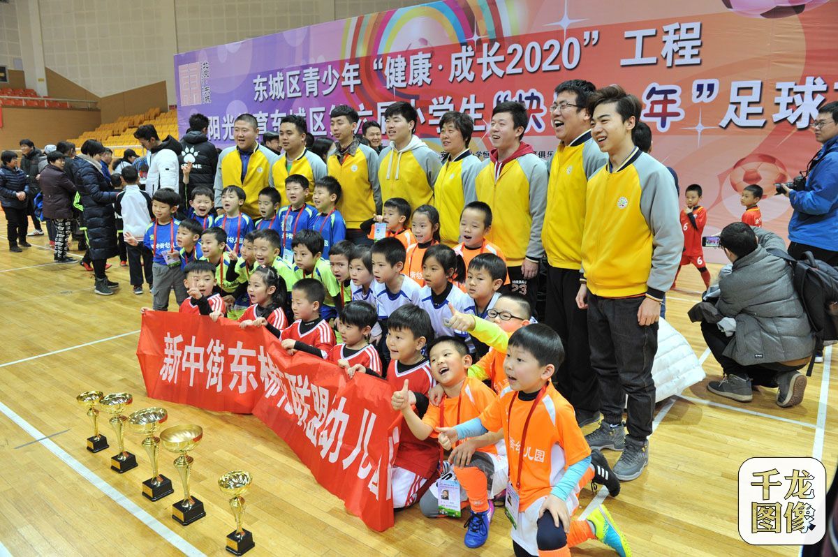 1月23日,东城区第六届“快乐少年”足球节决赛在地坛体育馆举行,此次比赛共计4天,来自东城区的9个幼儿园,28所小学的150余支球队近千名孩子参加比赛。图为获奖球队合影。千龙网发 吴晓萌摄