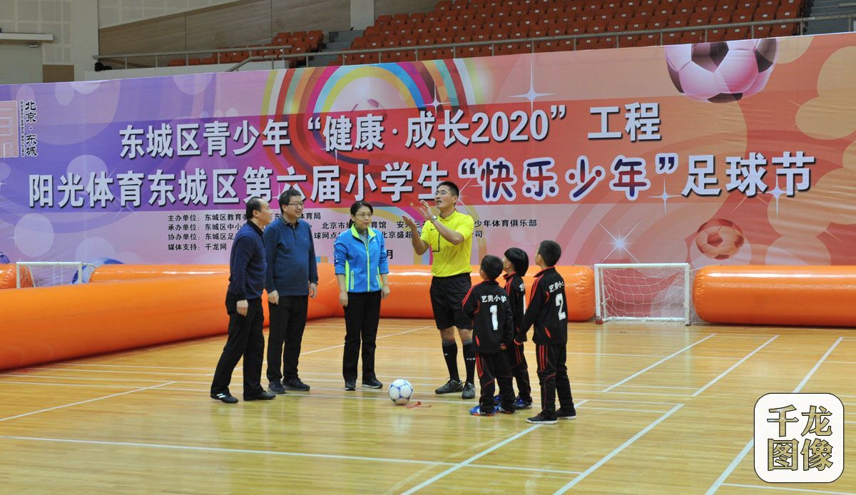1月23日,东城区第六届“快乐少年”足球节决赛在地坛体育馆举行,此次比赛共计4天,来自东城区的9个幼儿园,28所小学的150余支球队近千名孩子参加比赛。图为参加决赛球队条边。千龙网发 吴晓萌摄