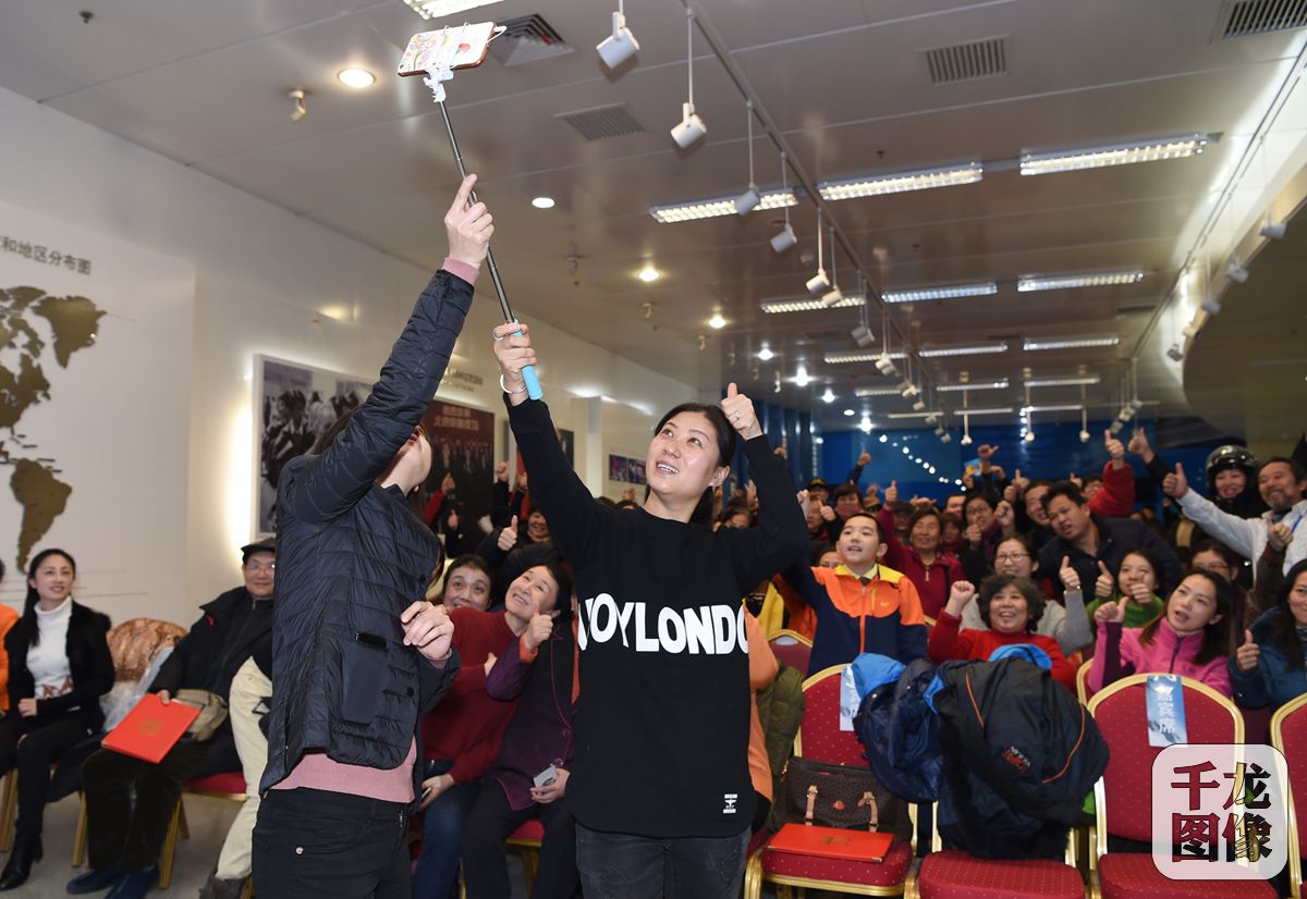 1月26日,朝阳区冬奥大讲堂第三讲在水立方举行,中国女子冰壶世界冠军柳荫向来自周边奥运村、亚运村、大屯街道的社区居民们讲解了冰壶运动的历史及比赛规则和战术。图为柳荫和听众自拍合影。千龙网发 夏波光摄