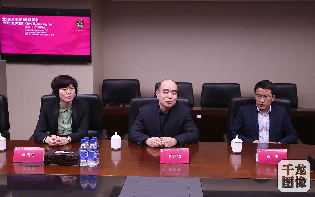 1月18日,北控凤凰足球俱乐部迎来新的主教练,瑞典人凯姆与球队签约,带队参加2018年中国足球协会女足超级联赛。图为北控凤凰足球俱乐部董事长赵建锁(中)致辞。千龙网记者 戚连民摄