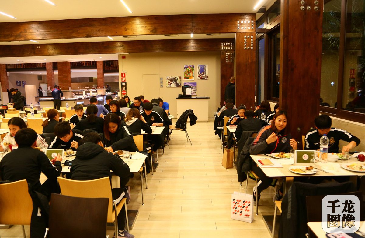 1月27日,经过长达将近20个小时的长途飞行,北京北控凤凰女足顺利抵达西班牙巴塞罗那,随后乘坐专车前往萨洛足球基地,为期18天的西班牙冬训正式拉开帷幕。图为队员在基地用餐。 千龙网发