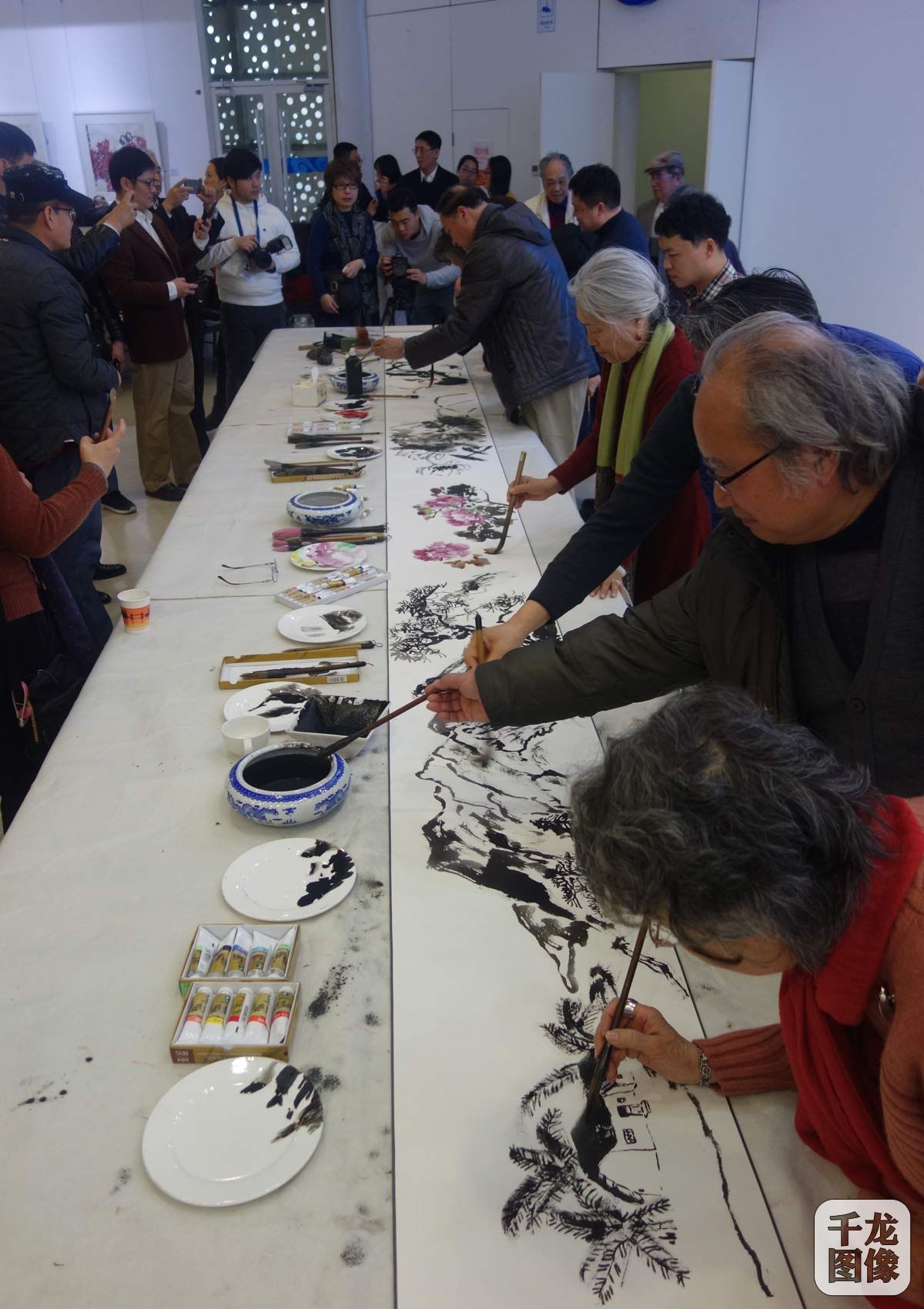 2月8日,2018年北京新年美展开展在水立方举行,12位老艺术家精心创作的72幅中国书画作品在此展出。图为参展艺术家们以“助力冬奥”为主题现场共同创作书画作品(长卷)。千龙网记者 戚连民摄