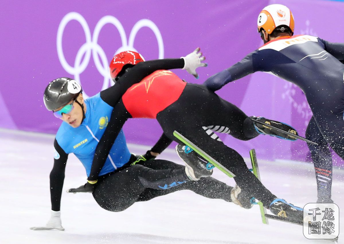 2月10日,平昌冬奥会短道速滑男子1500米半决赛中,分到同一组的三名中国选手韩天宇、武大靖、许宏志三人遭遇“碰撞潮”,最后仅有该项目索契冬奥会银牌获得者韩天宇进入B组决赛。图为本场比赛精彩瞬间。千龙网特约记者 萧峰摄
