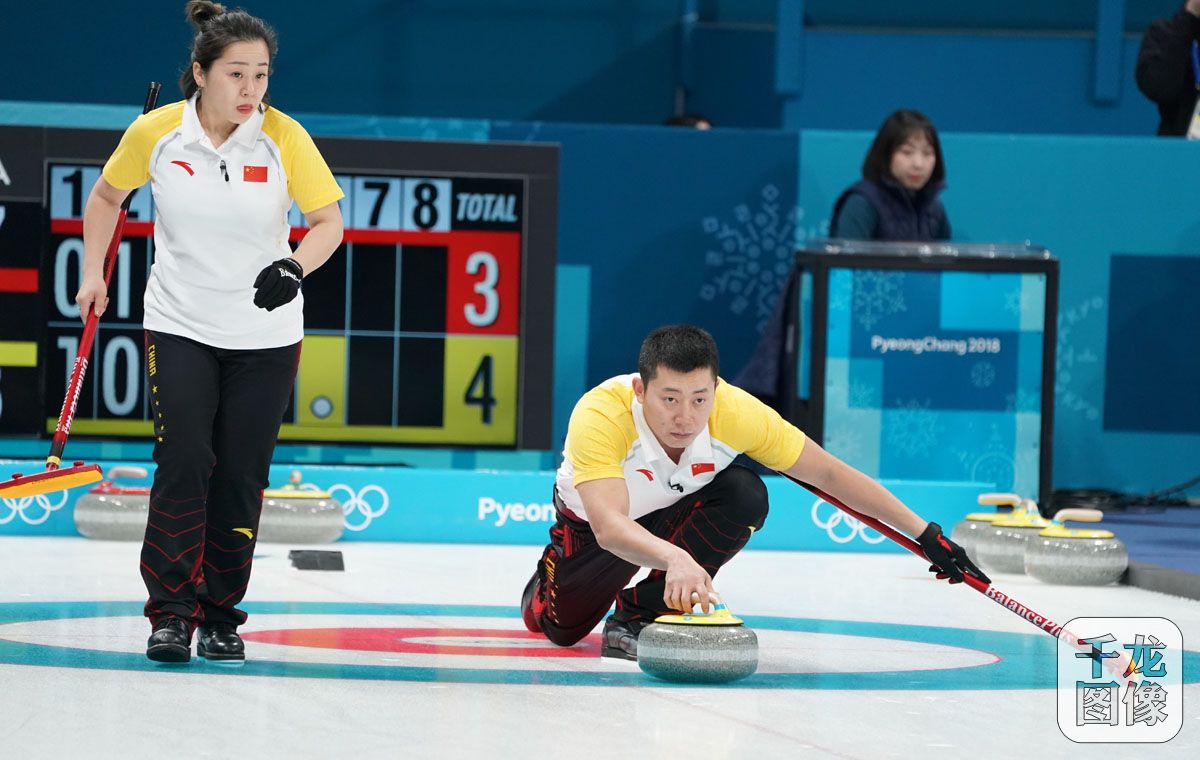 2月11日,平昌冬奥会冰壶混双比赛继续进行,中国组合王芮/巴德鑫9:3击败挪威队赢得三连胜,挤进了平昌冬奥会冰壶混双赛的附加赛。图为中国组合王芮/巴德鑫在比赛中。千龙网特约记者 萧峰摄