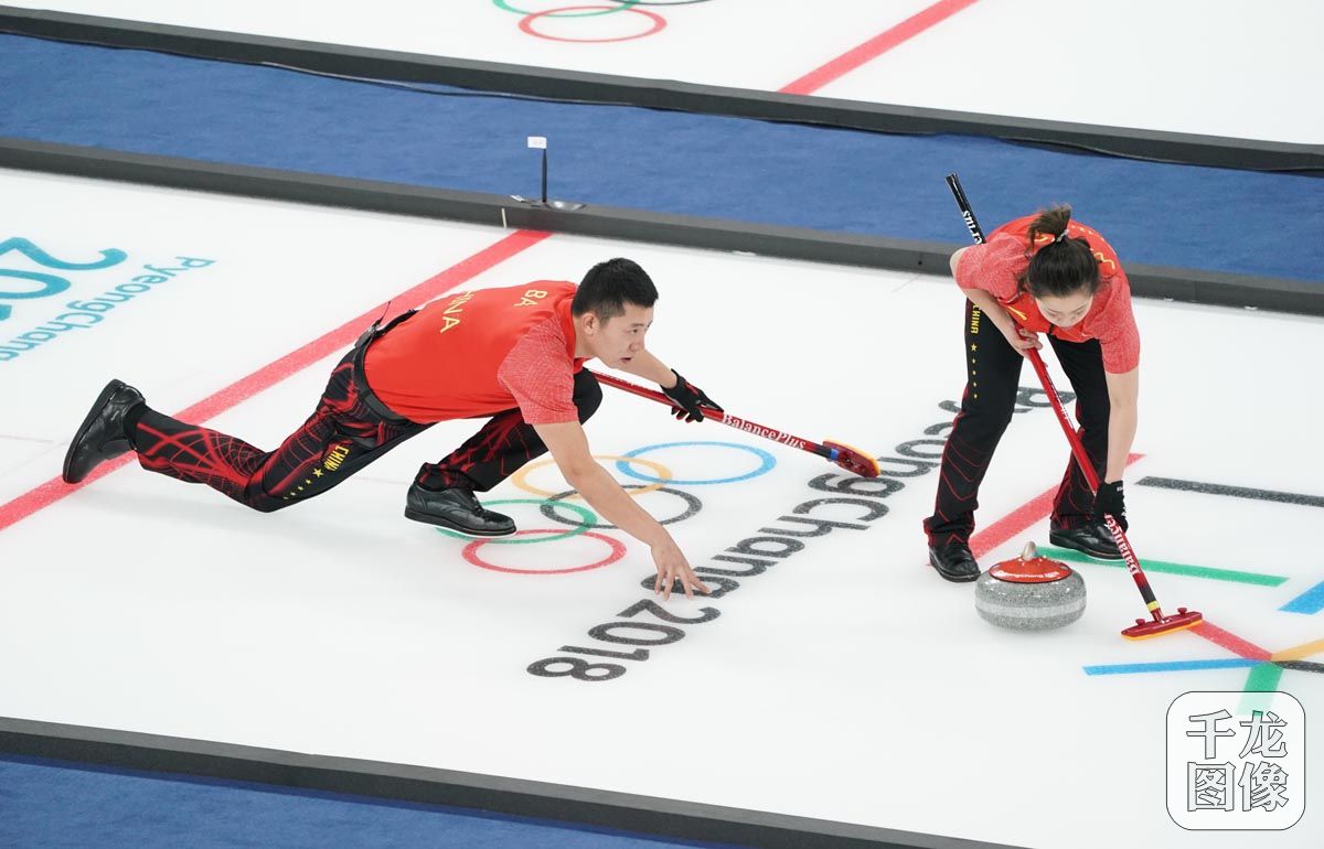 2月11日,2018年平昌冬奥会冰壶混双四强附加赛在江陵冰壶中心打响,由巴德鑫和王芮组成的中国队第六局丢掉四分,最终以7比9不敌挪威队,遗憾无缘四强。图为巴德鑫和王芮在比赛中。千龙网特约记者 萧峰摄
