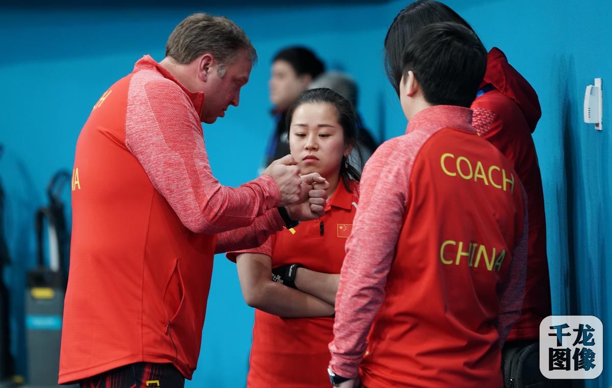 2月11日,2018年平昌冬奥会冰壶混双四强附加赛在江陵冰壶中心打响,由巴德鑫和王芮组成的中国队第六局丢掉四分,最终以7比9不敌挪威队,遗憾无缘四强。图为教练员给巴德鑫和王芮讲解战术。千龙网特约记者 萧峰摄
