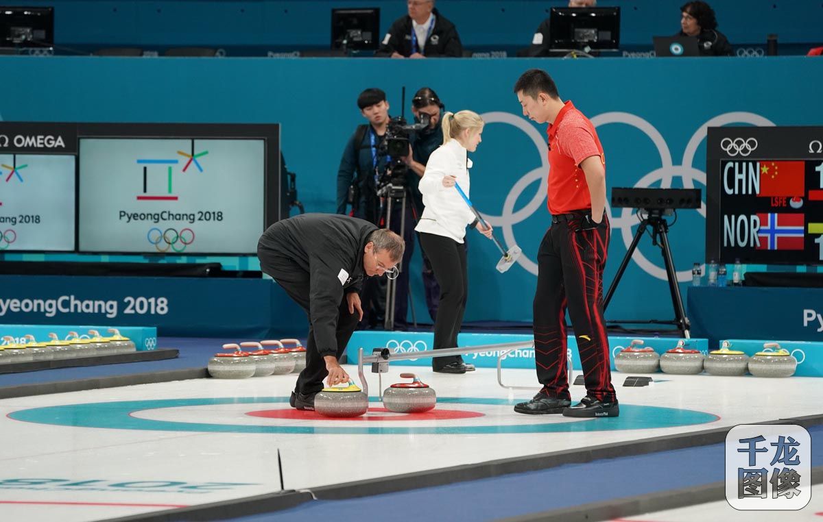 2月11日,2018年平昌冬奥会冰壶混双四强附加赛在江陵冰壶中心打响,由巴德鑫和王芮组成的中国队第六局丢掉四分,最终以7比9不敌挪威队,遗憾无缘四强。图为裁判认真执裁。千龙网特约记者 萧峰摄