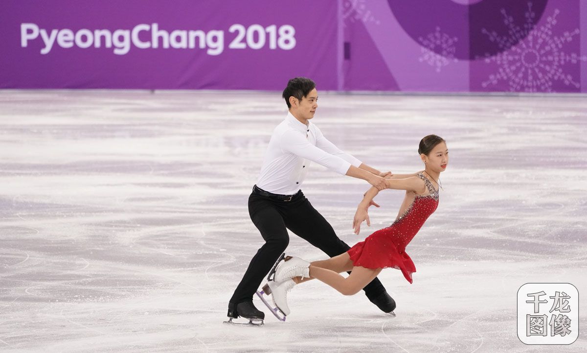 2月14日, 2018年平昌冬奥会在江陵冰上运动场展开第五个比赛日的较量。中国组合彭程/金杨、于小雨/张昊亮相赛场。图为彭程/金杨在比赛中。千龙网特约记者 萧峰摄