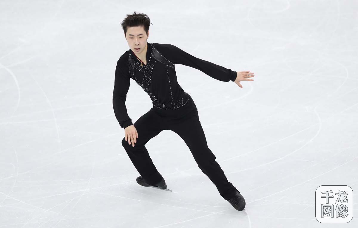 ↑2月16日,金博洋在比赛中。当日,2018年平昌冬奥会花样滑冰男子单人滑短节目比赛在江陵冰上运动场举行,中国选手金博洋以103.32分的成绩获得第4名。千龙网特约记者 萧峰摄
