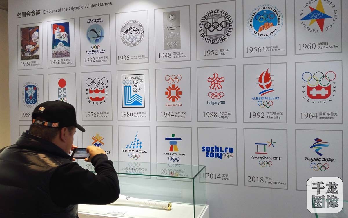 2月14日,“不忘初心相约2022”冬季奥林匹克体育文化展启动仪式在大栅栏历史文化保护区“北京坊”举行。图为启动仪式现场游客拍摄历届会徽。千龙网记者 戚连民摄