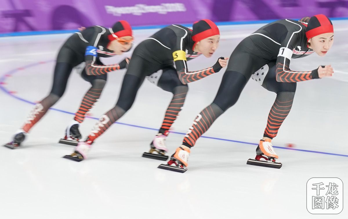 千龙网2月20日讯 平昌冬奥会速度滑冰女子团队追逐赛四分之一决赛2月19日结束,第二组出场的中国队滑出了3分00.01秒的成绩,尽管未能如愿进入前四名,挺进21日的半决赛。图为中国队在比赛中。千龙网特约记者 萧峰摄