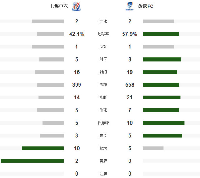 控球率方面,申花队落后悉尼FC队15.8个百分点;射门次数,申花队16-19落后悉尼队3次;射正次数,申花队5次,悉尼队8次,都攻入了两个进球。定位球方面,角球比5-7,任意球比5-10,申花队均落后。从整场比赛来看,申花队在处于劣势的情况下能战平对手实属不易。