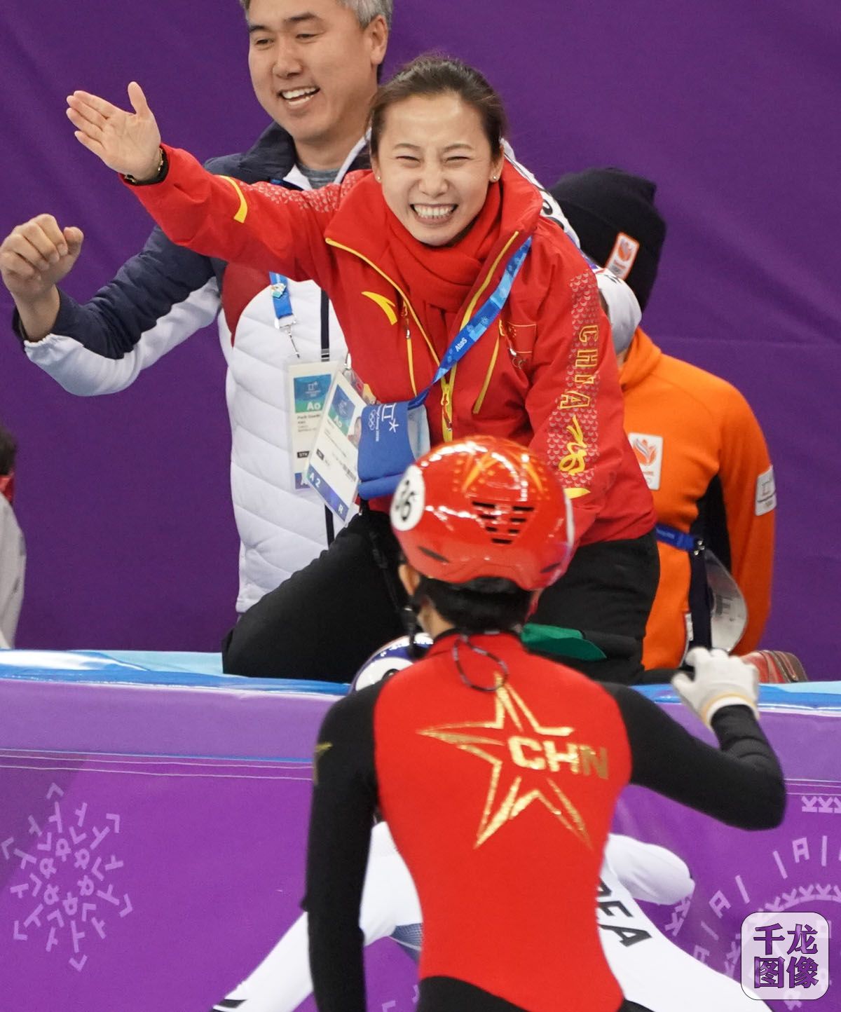 2月22日,2018平昌冬奥会短道速滑举行男子5000米接力决赛,由武大靖、韩天宇、许宏志、陈德全组成的中国队以6分32秒035的成绩惜败匈牙利队屈居亚军。图为主教练李琰和队员击掌相庆。千龙网特约记者 萧峰摄