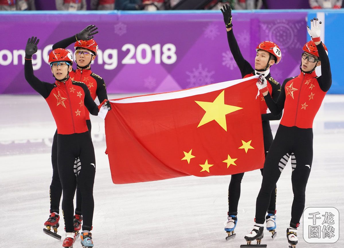 2月22日,2018平昌冬奥会短道速滑举行男子5000米接力决赛,由武大靖、韩天宇、许宏志、陈德全组成的中国队以6分32秒035的成绩惜败匈牙利队屈居亚军。图为中国队手举国旗庆祝。千龙网特约记者 萧峰摄