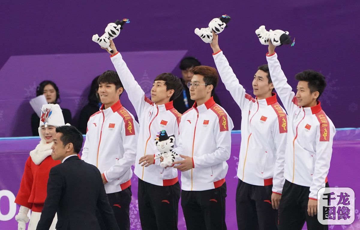 2月22日,2018平昌冬奥会短道速滑举行男子5000米接力决赛,由武大靖、韩天宇、许宏志、陈德全组成的中国队以6分32秒035的成绩惜败匈牙利队屈居亚军。图为中国队集体合影。千龙网特约记者 萧峰摄
