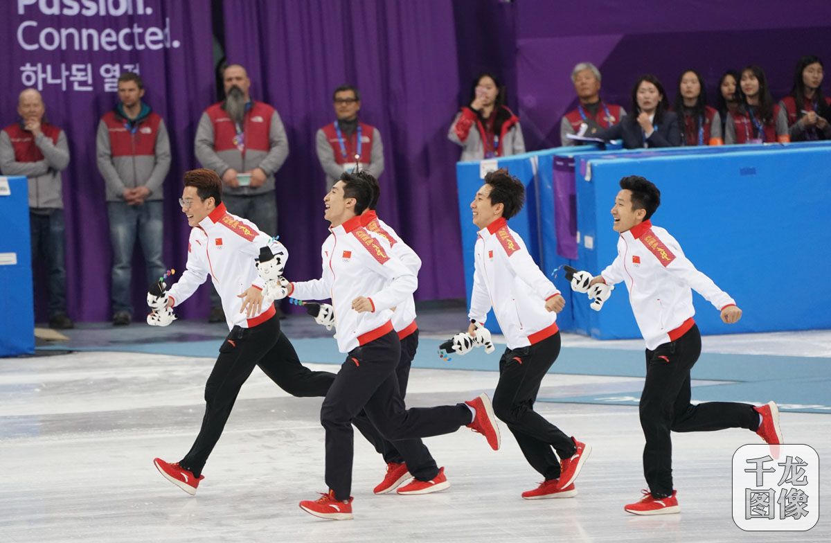 2月22日,2018平昌冬奥会短道速滑举行男子5000米接力决赛,由武大靖、韩天宇、许宏志、陈德全组成的中国队以6分32秒035的成绩惜败匈牙利队屈居亚军。图为中国队队员合影后跑向教练。千龙网特约记者 萧峰摄
