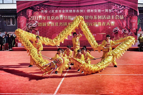 蛟龙飞腾闹元霄,当天上午,顺义区北务镇承办的舞龙大赛在北务村文化广场举行,有16支队伍参赛。村民们激情展示舞龙技艺,喜气洋洋庆祝元宵佳节,在当地掀起了全民健身高潮。