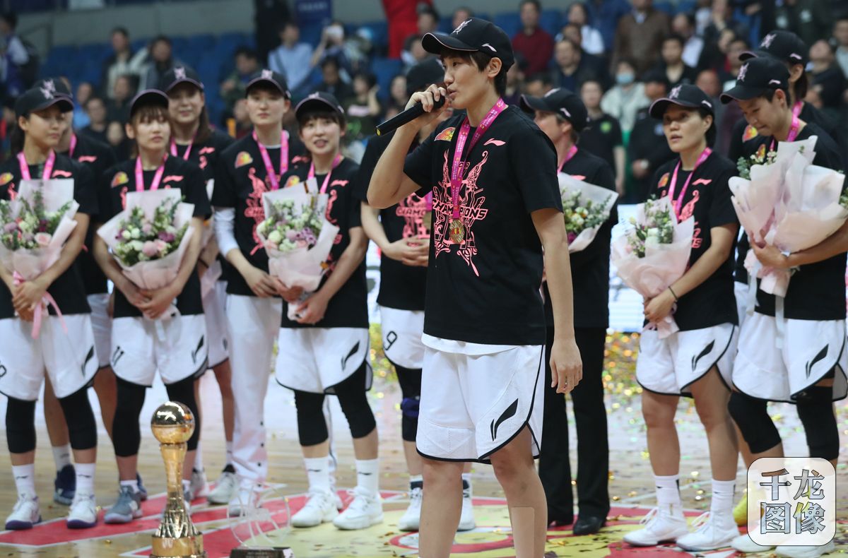 3月14日,2017-2018赛季WCBA总决赛进入第3场角逐,北京首钢女篮85-63战胜山西竹叶青女篮。以总比分3-0问鼎2018年WCBA总冠军,队成就WCBA三连冠伟业。图为赛后队员发言。千龙网发 胡科 萧峰摄