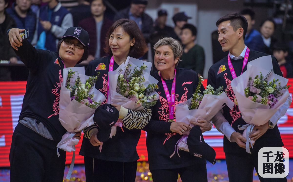 3月14日,2017-2018赛季WCBA总决赛进入第3场角逐,北京首钢女篮85-63战胜山西竹叶青女篮。以总比分3-0问鼎2018年WCBA总冠军,队成就WCBA三连冠伟业。图为赛后队员教练们自拍合影。千龙网发 胡科 萧峰摄