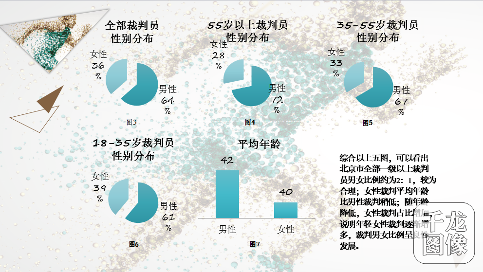 全部一级以上裁判员中,男性2105人,女性1158人,18-25岁98人,25-35岁887人,35-45岁1007人,45-55岁762人,55-65岁355人,65岁以上90人,平均年龄41岁(另有64人未登记年龄信息)。北京市全部一级以上裁判员男女比例约为2:1,较为合理;女性裁判平均年龄比男性裁判稍低;随年龄降低,女性裁判占比增加,说明年轻女性裁判逐渐增多,裁判男女比例呈良性发展。北京市裁判集中分布在25-55岁这个年龄段,说明青壮年是裁判员队伍的中坚力量。55岁以上裁判员人数只占总数的13%,65岁以上和25岁以下的裁判员数量基本持平,说明裁判员队伍结构合理,新老交替过程平缓。