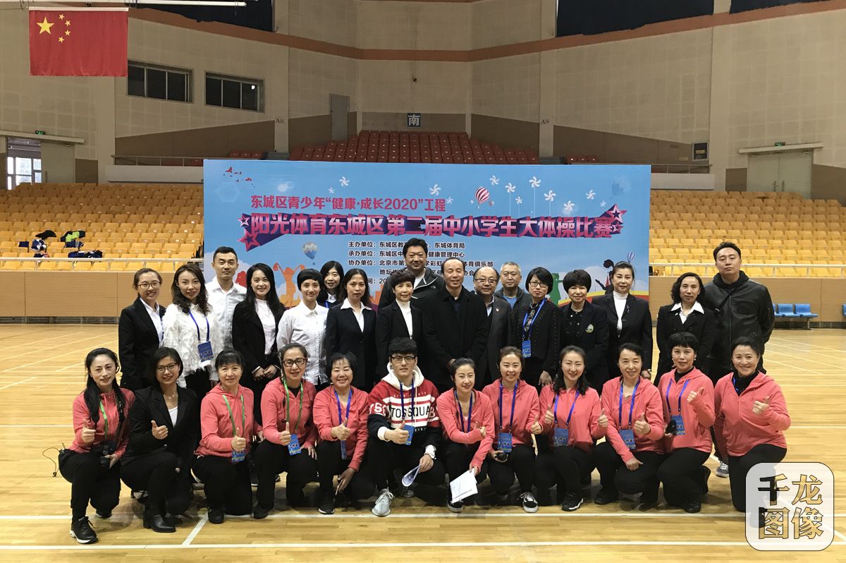 3月23日,阳光体育东城区第二届中小学生大体操比赛在地坛体育馆火热开场,来自东城区35个参赛单位59支队伍近两千名学生在这里展示他们的自信、魅力与激情。图为领导、裁判及工作人员合影。千龙网发 高宇摄