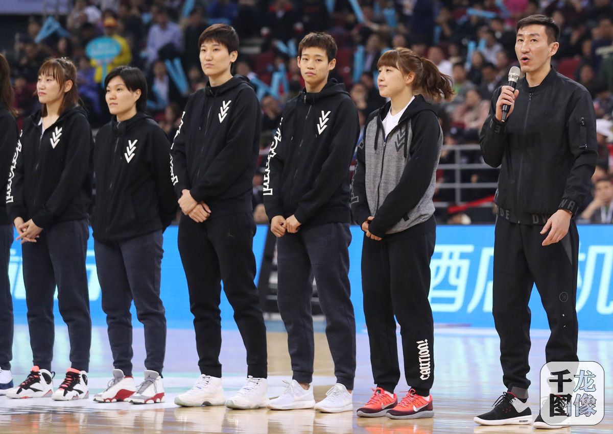 3月22日,北京首钢男篮主场以72比75惜败于辽宁本钢队,在2017至2018赛季CBA季后赛1/4决赛中未能突破辽宁这一关,以总比分1比3被淘汰,止步四强。图为张云松携女篮队员到场助威。千龙网发 萧峰摄