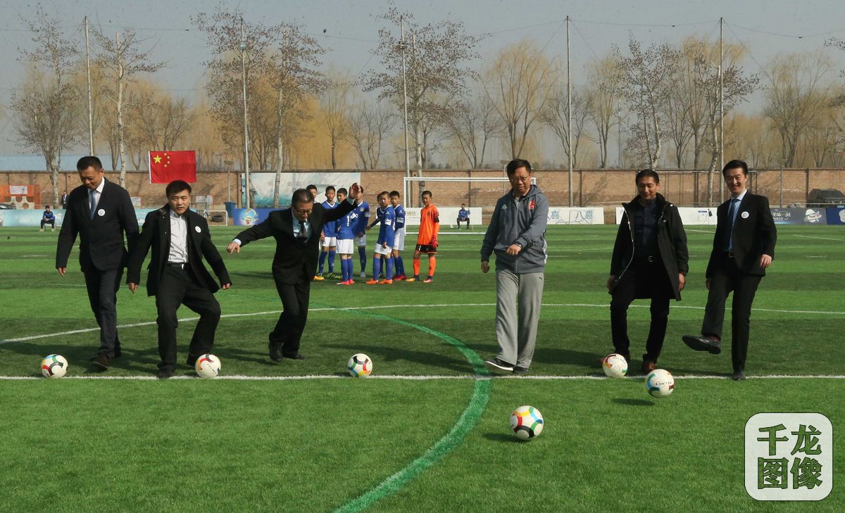 3月24日,2018年北京市青少年足球俱乐部联赛(简称京少联赛)在北京八喜联合竞技足球俱乐部启动。图为与会领导为开幕式上的揭幕战开球。千龙网记者 戚连民摄