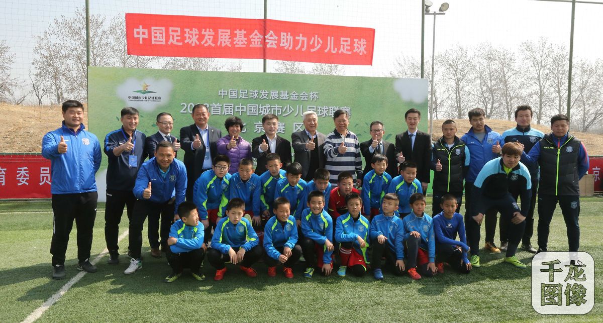 3月24日,“中国足球发展基金会杯”2018首届中国少儿足球联赛(北京赛区)在北京绿茵阳光足球俱乐部揭开战幕。图为与会嘉宾和球员合影。千龙网记者 戚连民摄