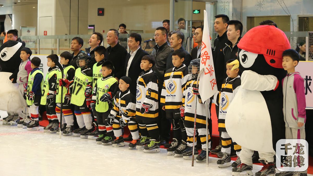 3月25日,海淀区第三届中小学冰球联赛开幕式在华润五彩冰酷运动中心举行,比赛将历时一个多月,600余名中小学参与角逐。图为参加开幕式的领导和小球员合影。千龙网记者 戚连民摄