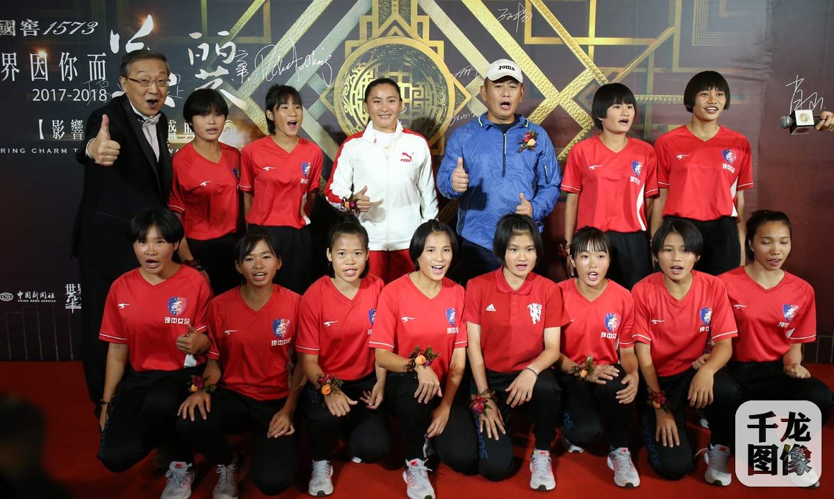 3月30日,“世界因你而美丽——2017-2018影响世界华人盛典” 颁奖典礼3月30日在清华大学举行,在竞技体育领域,三位“中国速速”:中国国家游泳队运动员孙杨,中国国家田径队运动员苏炳添,中国国家短道速滑队运动员武大靖获得大奖。图为琼中女足集体合影。千龙网记者 戚连民摄