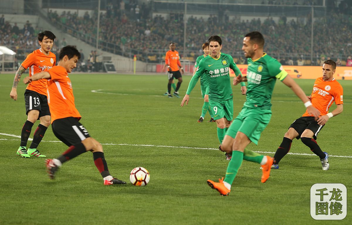 3月31日,2018赛季中超联赛第4轮,北京中赫国安主场迎战北京人和,上演首次京城德比。结果上半场索里亚诺主罚任意球建功,下半场于洋、比埃拉先后破门,于大宝点球再下一城,最终北京中赫国安在主场4比0战胜北京人和。图为本场比赛精彩瞬间。千龙网记者 戚连民摄
