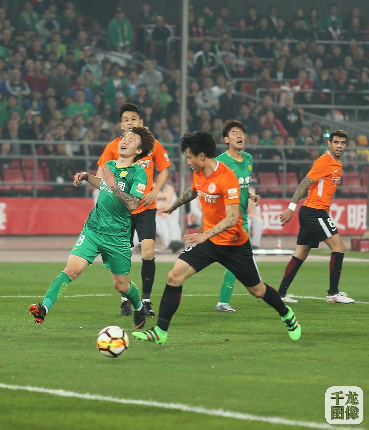 3月31日,2018赛季中超联赛第4轮,北京中赫国安主场迎战北京人和,上演首次京城德比。结果上半场索里亚诺主罚任意球建功,下半场于洋、比埃拉先后破门,于大宝点球再下一城,最终北京中赫国安在主场4比0战胜北京人和。图为本场比赛精彩瞬间。千龙网记者 戚连民摄