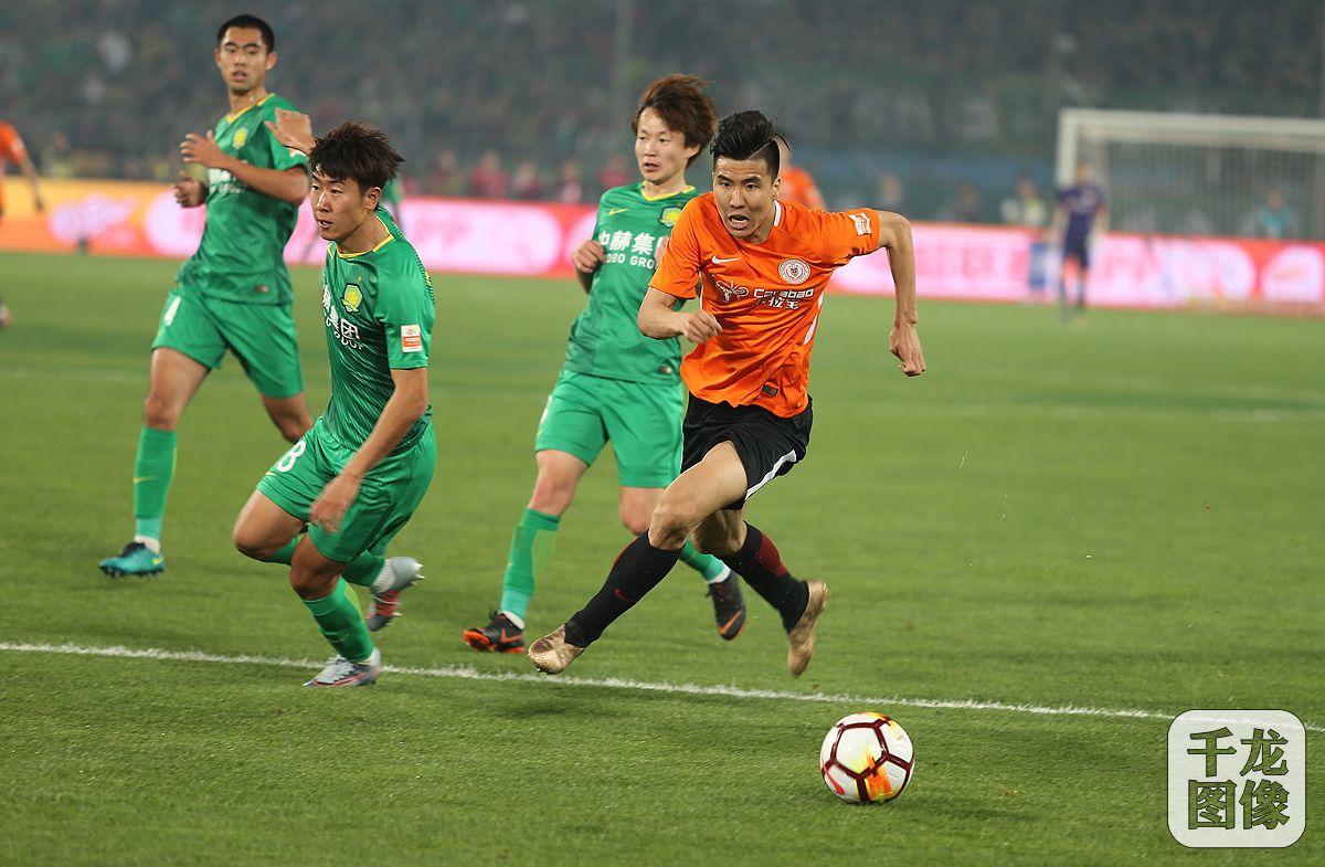 3月31日,2018赛季中超联赛第4轮,北京中赫国安主场迎战北京人和,上演首次京城德比。结果上半场索里亚诺主罚任意球建功,下半场于洋、比埃拉先后破门,于大宝点球再下一城,最终北京中赫国安在主场4比0战胜北京人和。图为本场比赛精彩瞬间。千龙网记者 戚连民摄