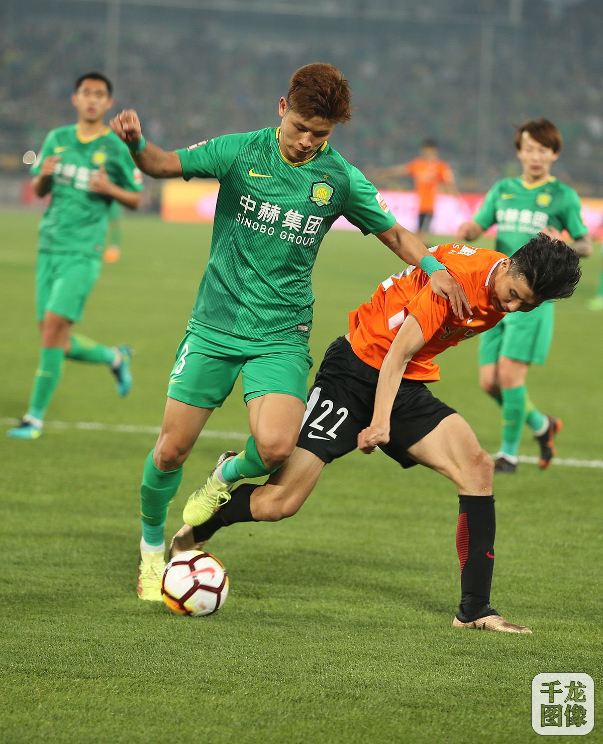 3月31日,2018赛季中超联赛第4轮,北京中赫国安主场迎战北京人和,上演首次京城德比。结果上半场索里亚诺主罚任意球建功,下半场于洋、比埃拉先后破门,于大宝点球再下一城,最终北京中赫国安在主场4比0战胜北京人和。图为本场比赛精彩瞬间。千龙网记者 戚连民摄