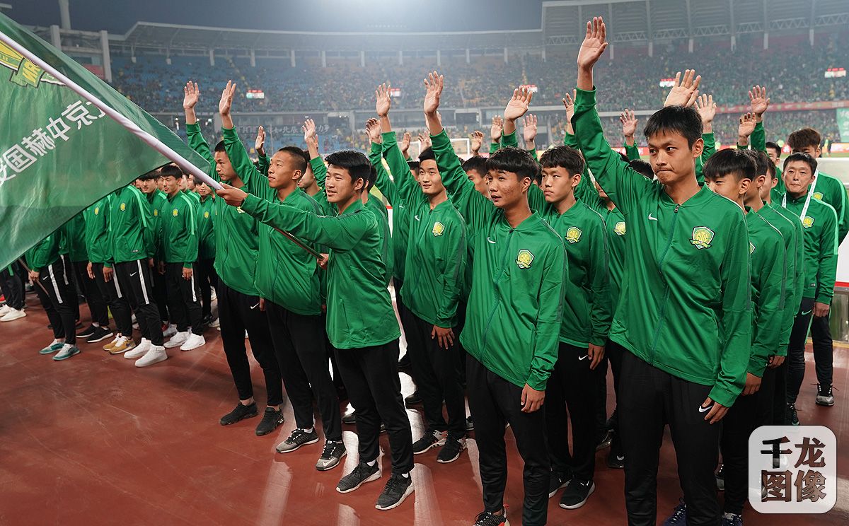3月31日,2018赛季中超联赛第4轮,北京中赫国安主场迎战北京人和,上演首次京城德比。结果上半场索里亚诺主罚任意球建功,下半场于洋、比埃拉先后破门,于大宝点球再下一城,最终北京中赫国安在主场4比0战胜北京人和。图为本场比赛国安青训队员集体亮相。千龙网记者 戚连民摄