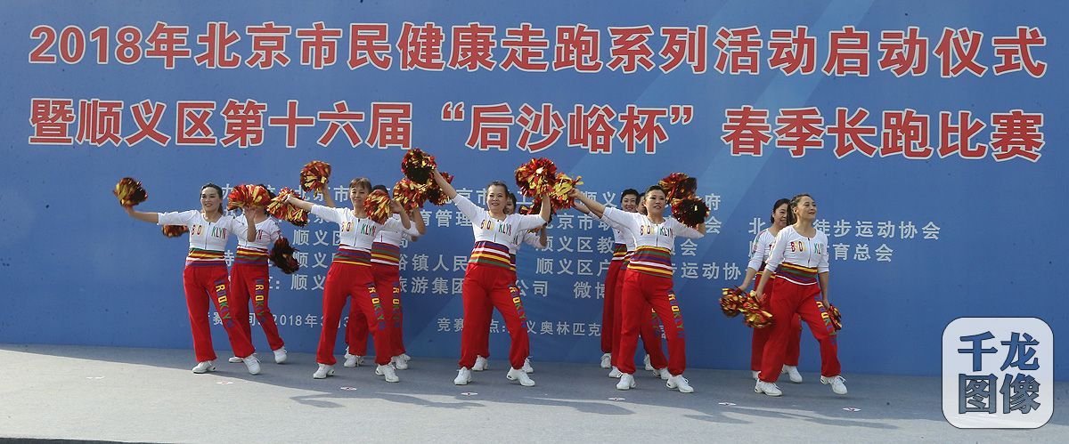 3月31日,2018年北京市民健康走跑系列活动暨顺义区第16届“后沙峪杯”春季长跑比赛在顺义奥林匹克水上公园举行,来自北京市职工队伍、徒步长跑爱好者团体和顺义各单位的2022名市民代表报名参赛。图为活动现场热身舞蹈表演。千龙网记者 戚连民摄