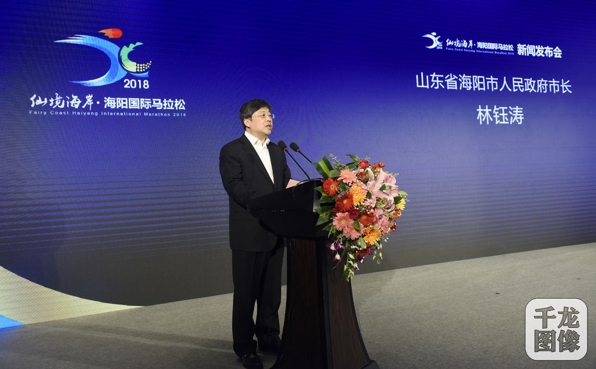 4月1日,2018仙境海岸﹒海阳国际马拉松新闻发布会暨赛事报名启动仪式在京举行。图为海阳市人民政府市长林钰涛致辞。千龙网发 主办方供图