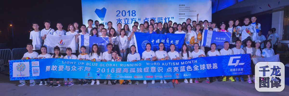 4月2日,“2018水立方点亮蓝灯暨‘勇敢爱 与众不同’全球联跑活动”在京举行,奥运冠军陈一冰领衔15名热心公益的蓝爸爸以认领星宝贝画作制成的头巾方式,帮助星宝贝发声,倡议社会各界关注、共同为他们打开孤独的世界。图为陈一冰(右二)在活动现场。千龙网发 北京市体育基金会供图