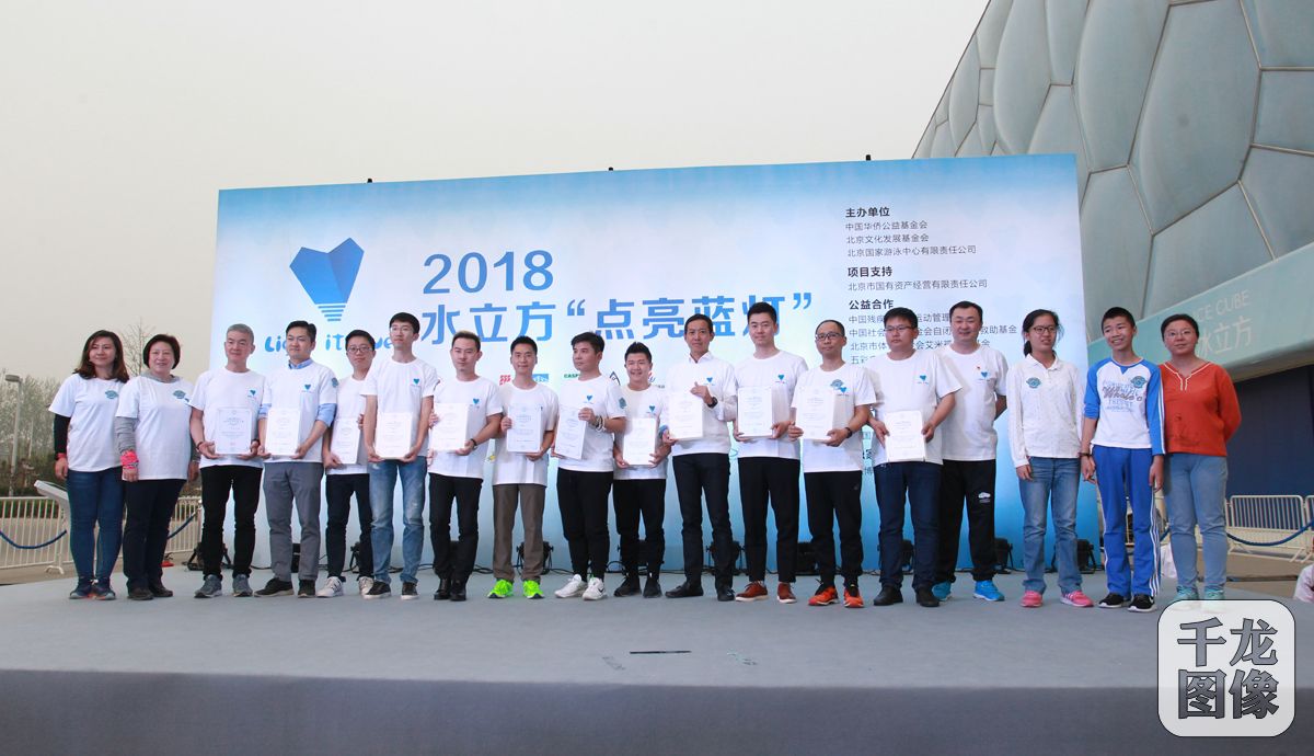 4月2日,“2018水立方点亮蓝灯暨‘勇敢爱 与众不同’全球联跑活动”在京举行,奥运冠军陈一冰领衔15名热心公益的蓝爸爸以认领星宝贝画作制成的头巾方式,帮助星宝贝发声,倡议社会各界关注、共同为他们打开孤独的世界。图为活动现场。千龙网发 北京市体育基金会供图