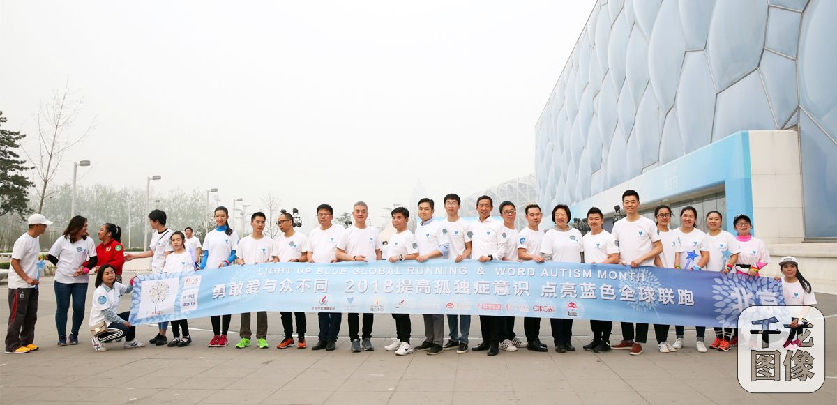 4月2日,“2018水立方点亮蓝灯暨‘勇敢爱 与众不同’全球联跑活动”在京举行,奥运冠军陈一冰领衔15名热心公益的蓝爸爸以认领星宝贝画作制成的头巾方式,帮助星宝贝发声,倡议社会各界关注、共同为他们打开孤独的世界。图为活动现场。千龙网发 北京市体育基金会供图