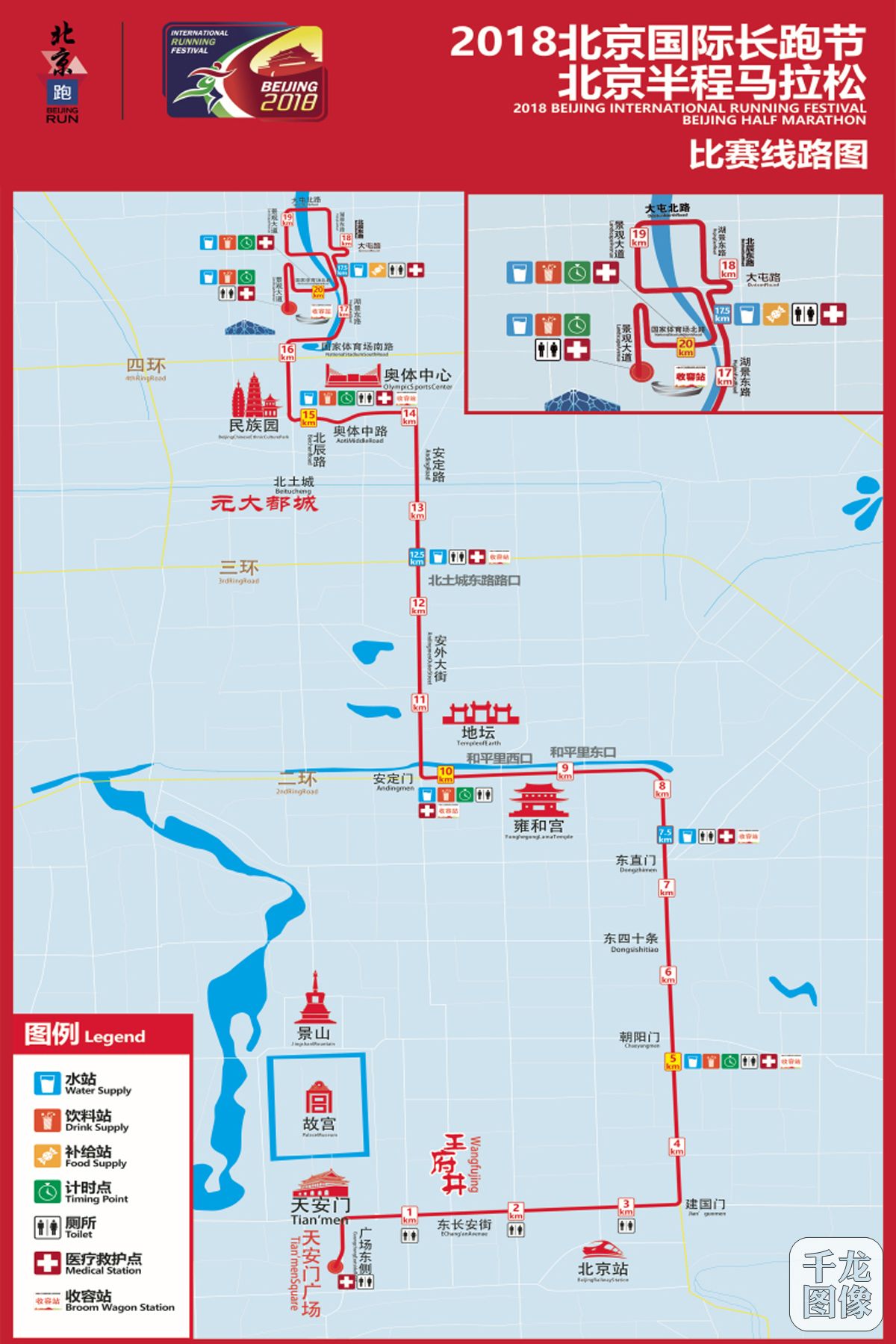 半程马拉松:由天安门广场出发,经广场东侧路、东长安街、东、北二环辅路(建国门桥至安定门桥)、安外大街、安定路、奥体中路、北辰路(北向)、国家体育场南路(东向)、湖景东路南段、中段(北向)、大屯路(东向、西向)、湖景东路北段(北向)、大屯北路(西向)、奥林匹克公园景观大道(南向)、大屯路(东向)、湖景东路中段(南向)、国家体育场北路(西向)、奥林匹克公园景观大道(北向)、奥林匹克公园景观大道(南向)、奥林匹克公园庆典广场到达比赛终点。
